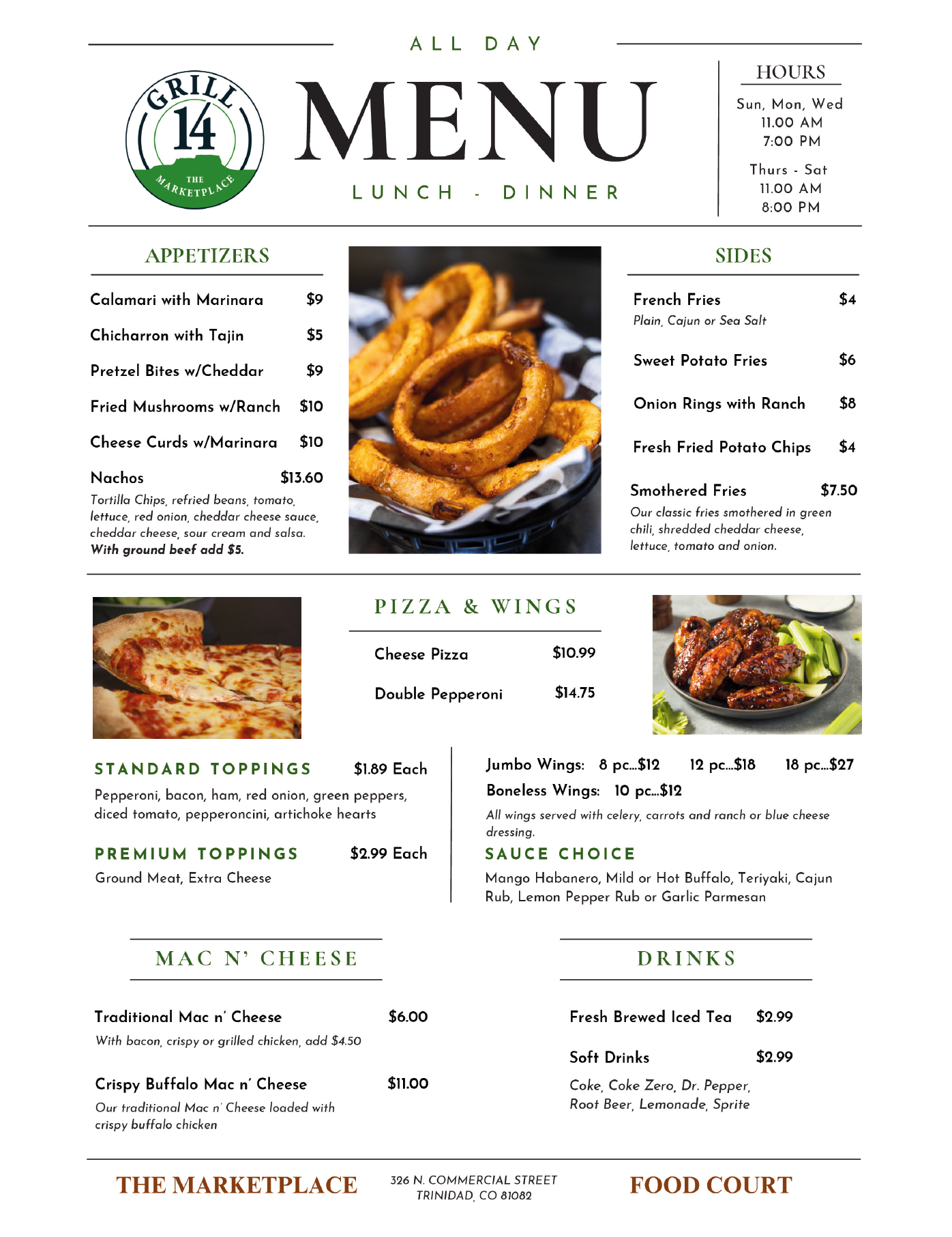 Grill 14 is proud to serve locally sourced farm-to-table meals inspired by Trinidad and Las Animas County’s rich heritage including our Burnt End Sandwich, a variety of refreshing House Salads, and our green chili Slopper. Stop on by for an authentic taste of Trinidad’s culture! We look forward to seeing you!